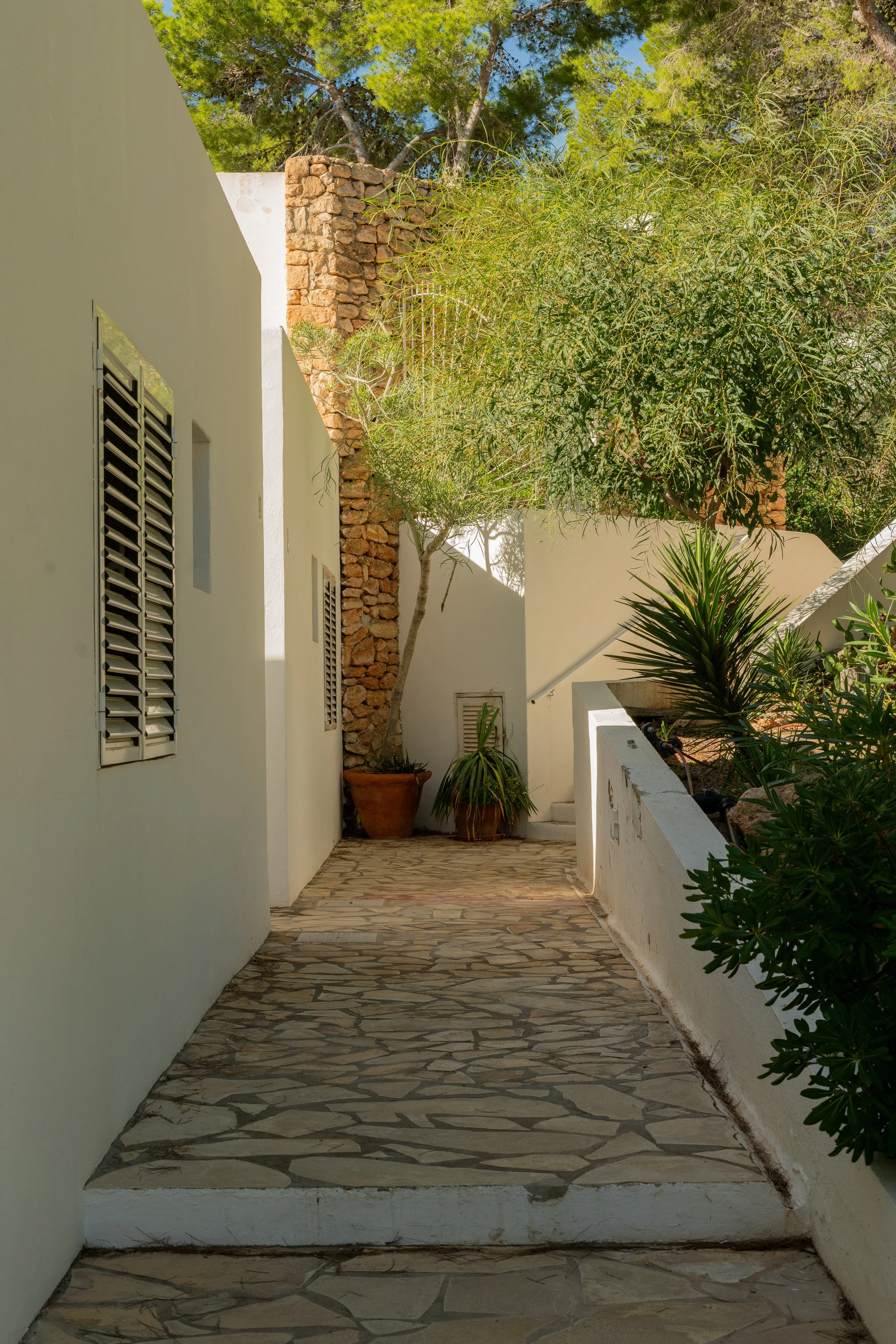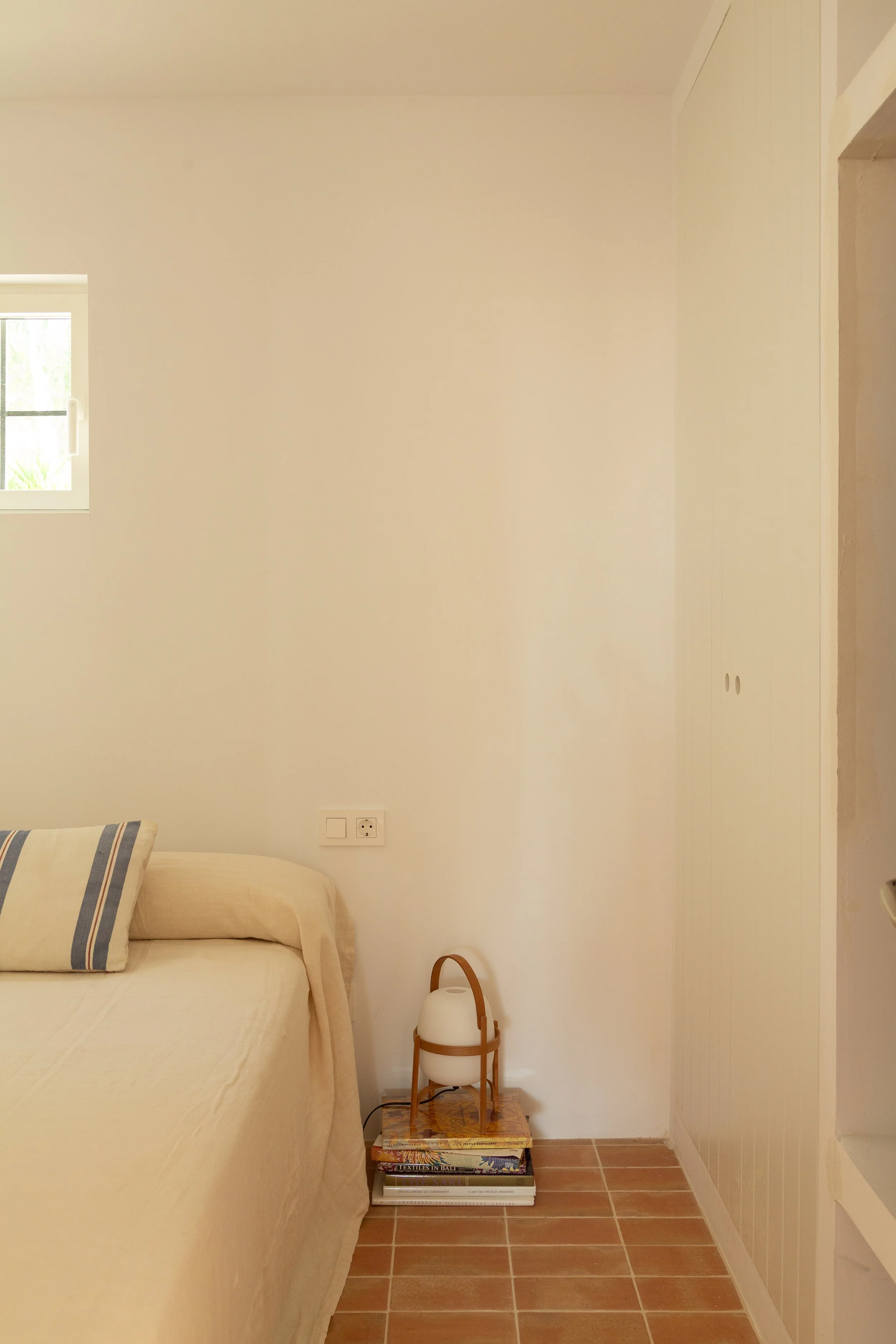 La zona más privada de la casa queda al oeste, donde se sitúan dos habitaciones y un baño alrededor de un distribuidor, que hace también de recepción de la vivienda. Aquí la luz llega suavemente, y la protección de los pinos da sombra en la tarde, así como favorece la ventilación cruzada.