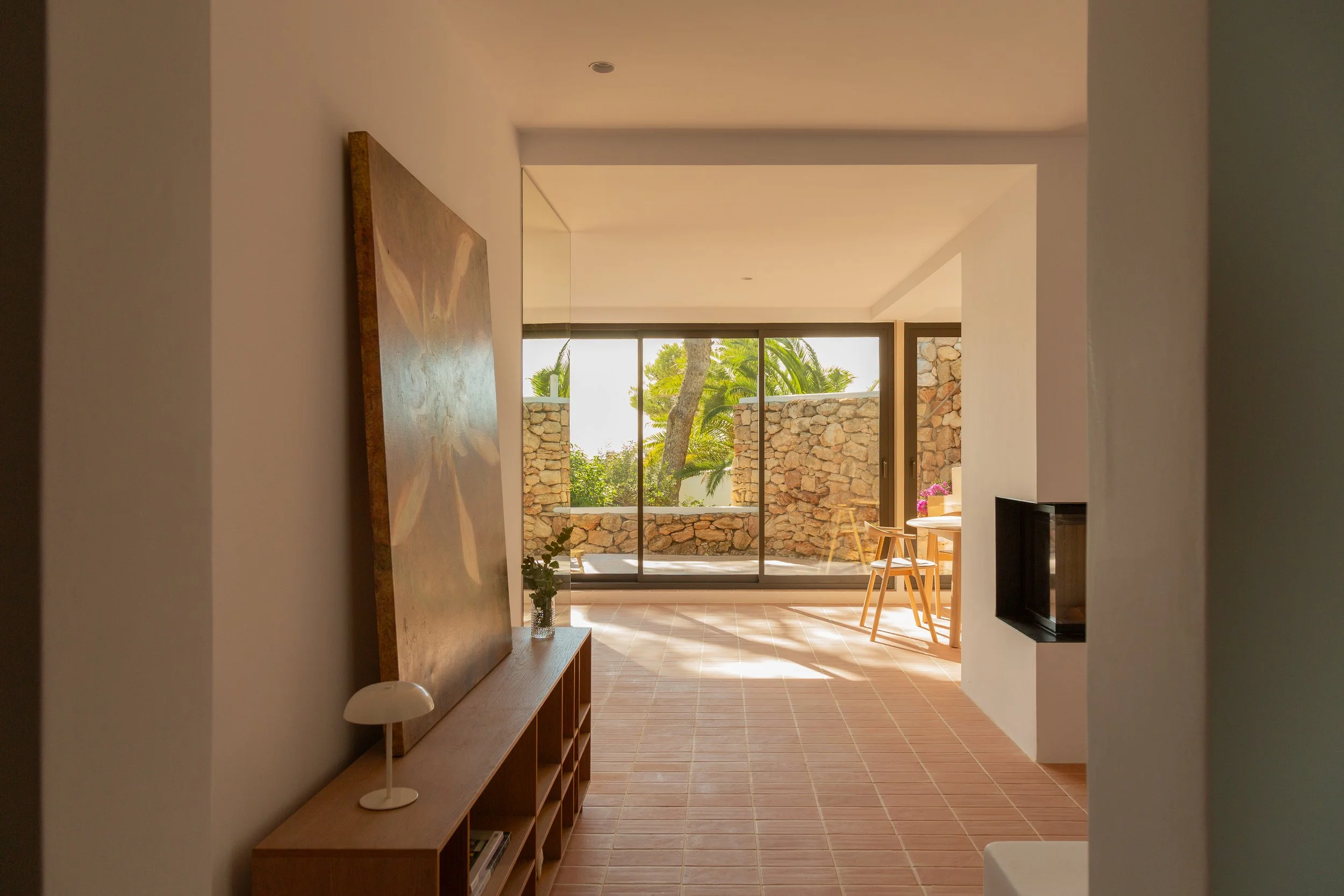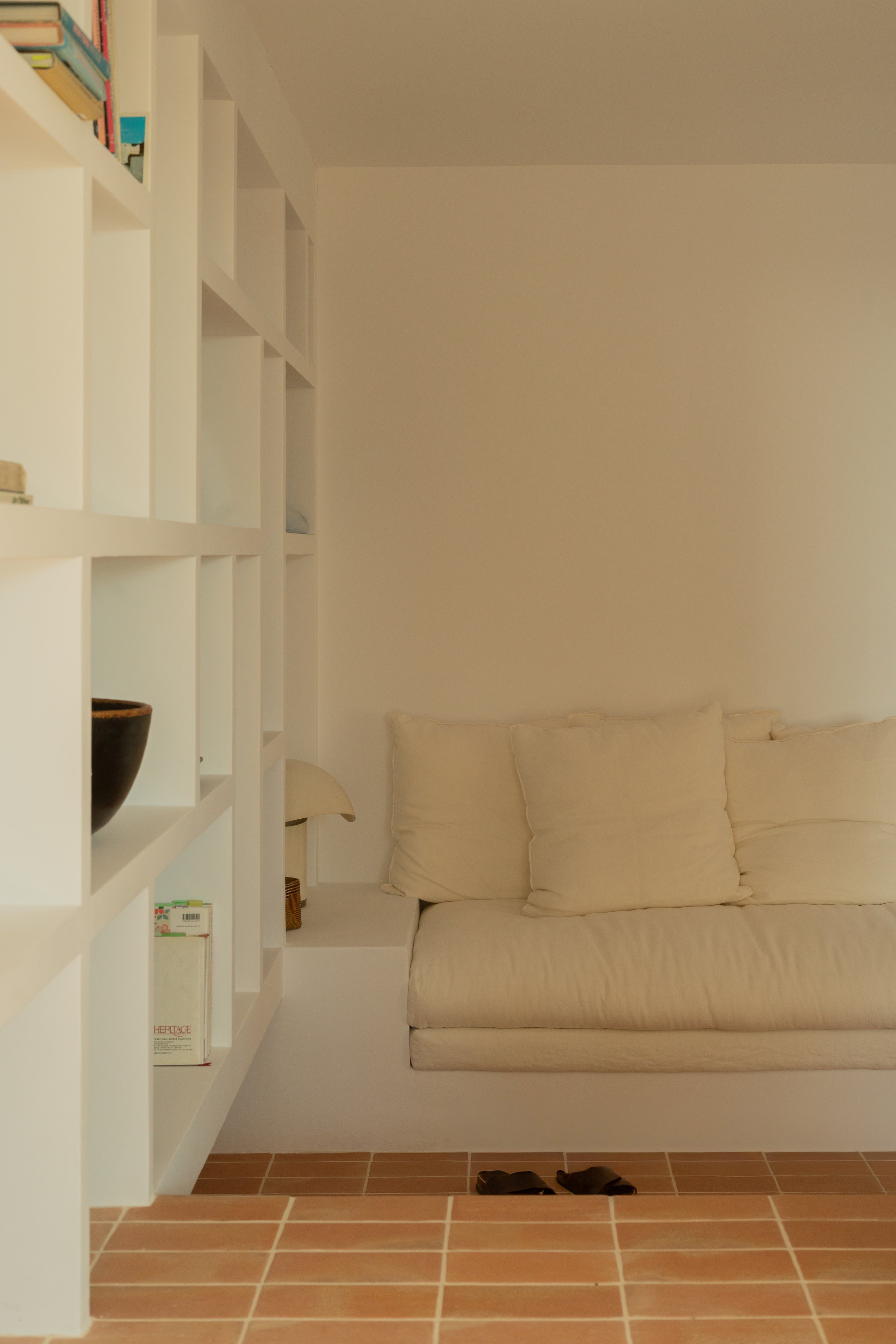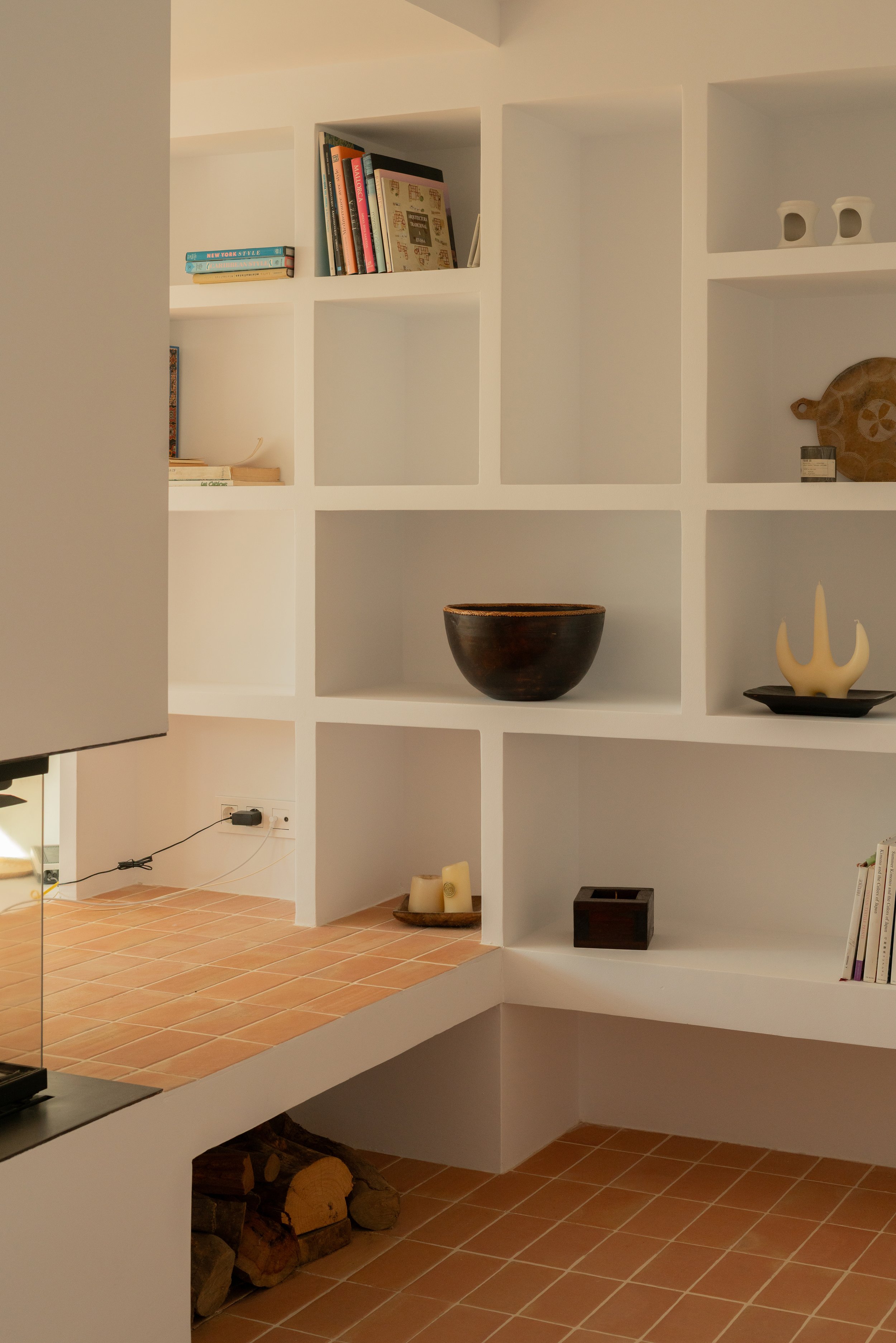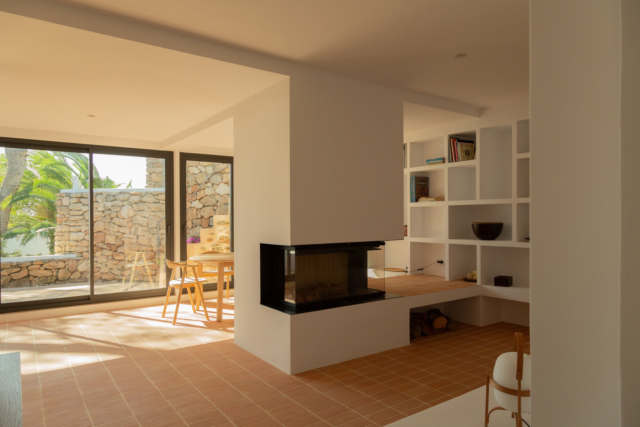 De un lado, una estantería de obra acompaña a la mirada a lo largo de toda la casa, acogiendo los distintos recuerdos de todas dos vidas. Del otro, un espejo rebota toda la luz del mediterráneo y relaciona los distintos espacios que rodean el elemento central de la casa: la chimenea.