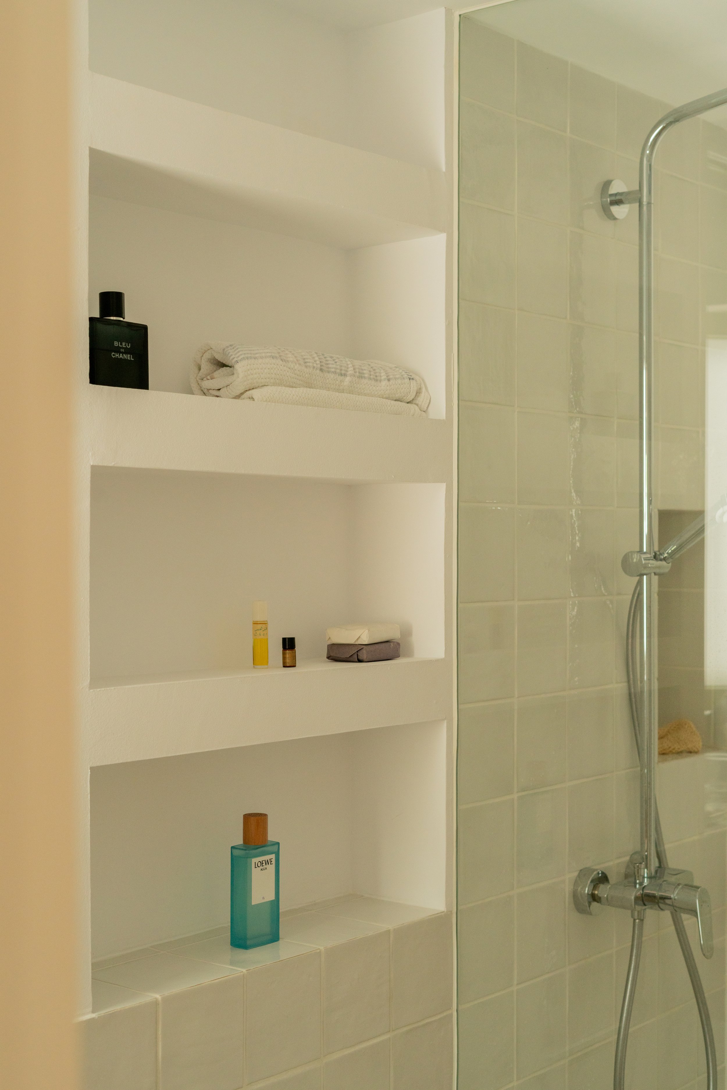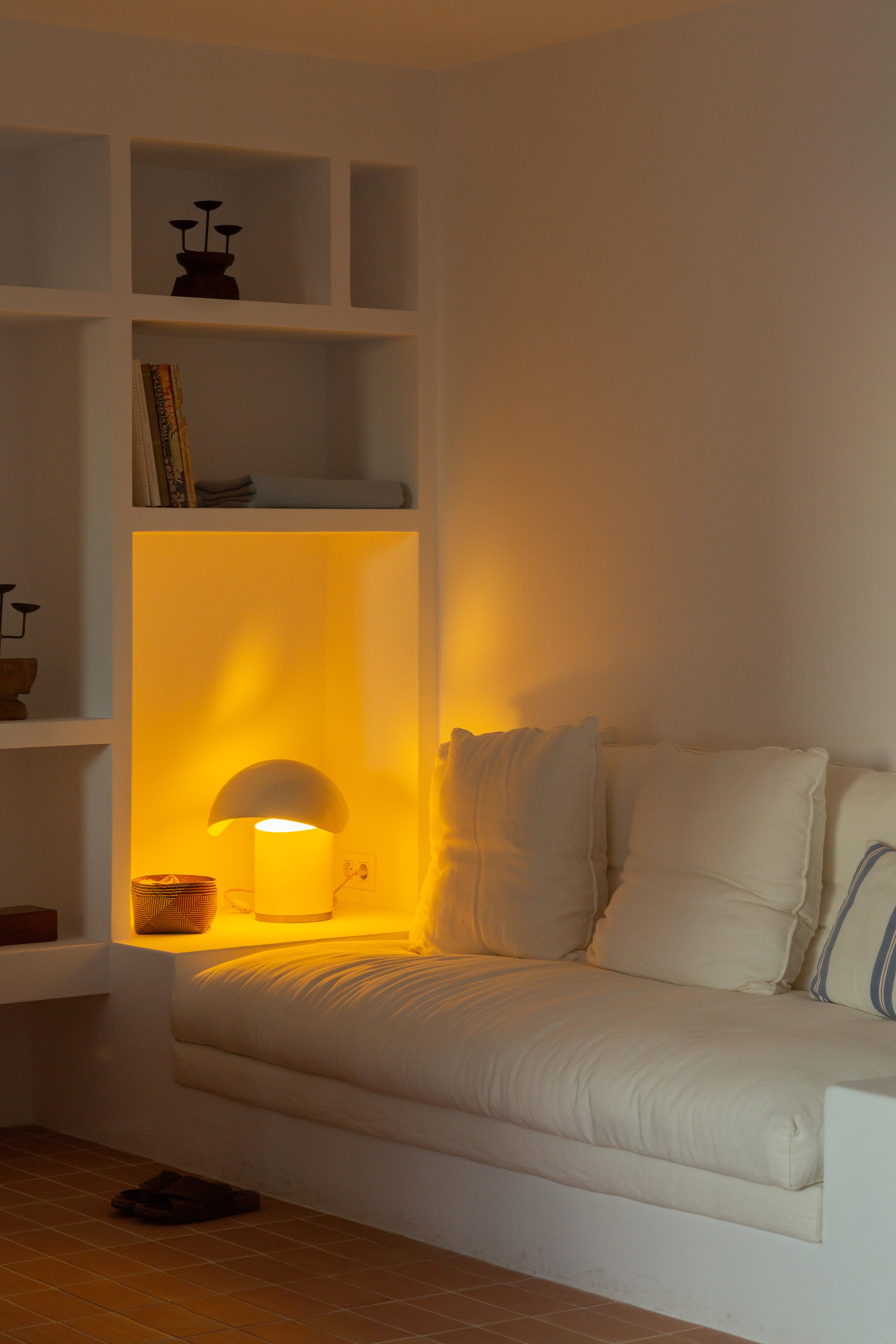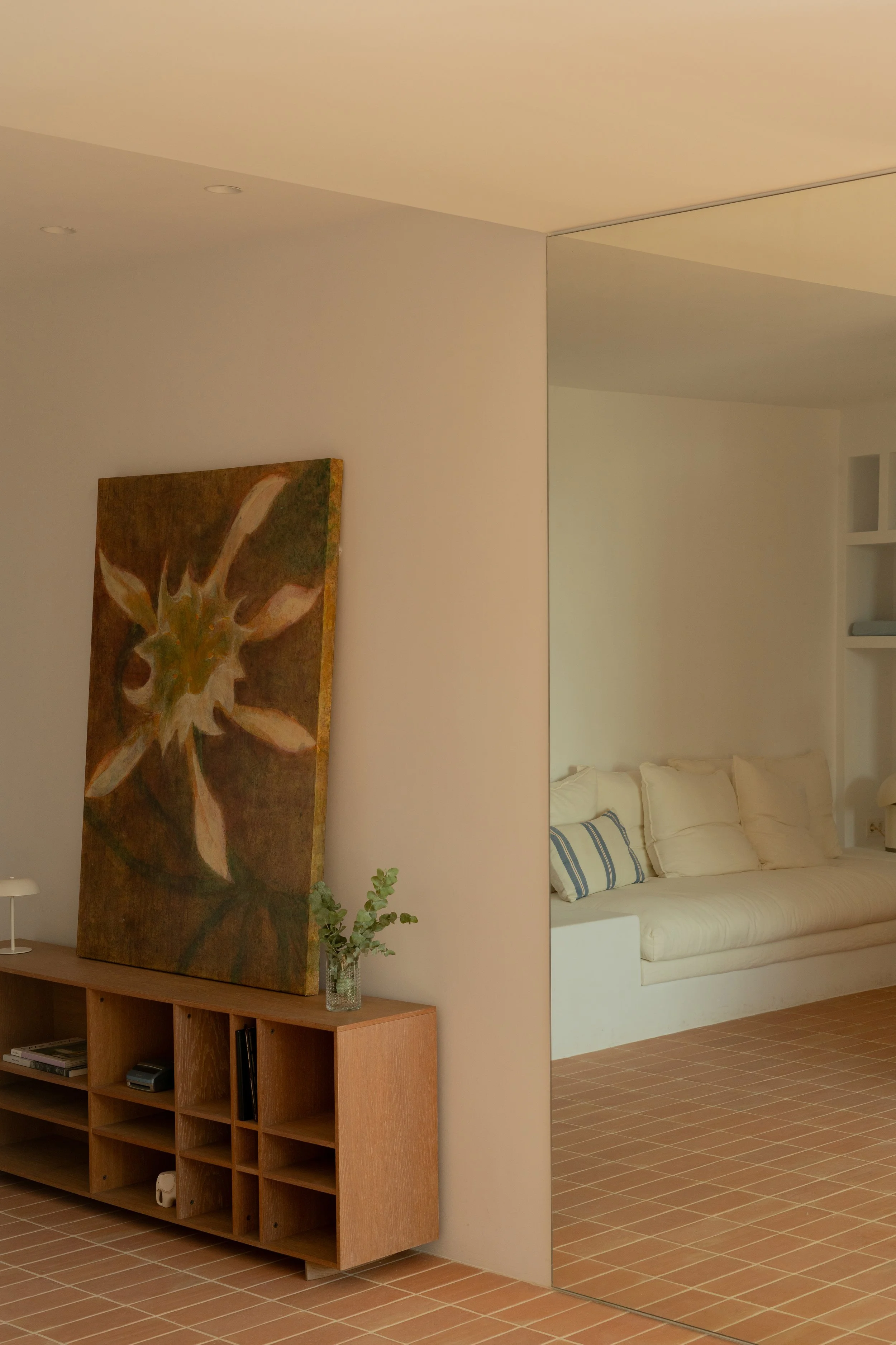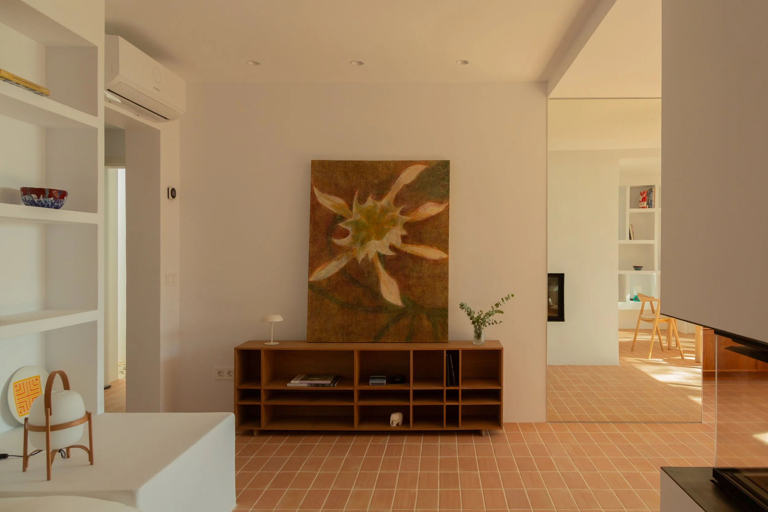 De un lado, una estantería de obra acompaña a la mirada a lo largo de toda la casa, acogiendo los distintos recuerdos de todas dos vidas. Del otro, un espejo rebota toda la luz del mediterráneo y relaciona los distintos espacios que rodean el elemento central de la casa: la chimenea.